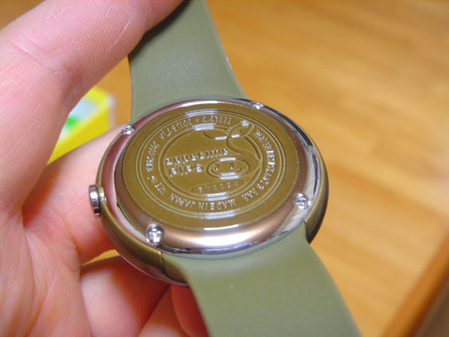 時計の裏蓋にも、このストラップについているのと同じマスコットキャラが彫り込まれています。