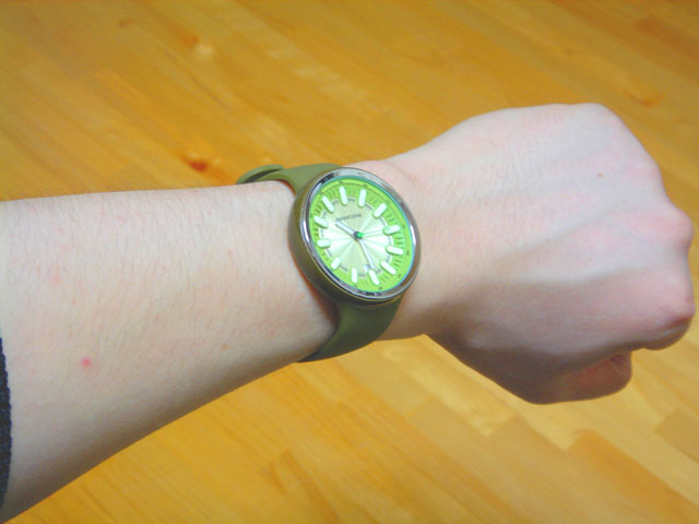 カジュアルでユニセックスに着けることのできそうな腕時計ですが、実際のサイズはどんな感じかと言うと、私が着けたときにはこのくらい。